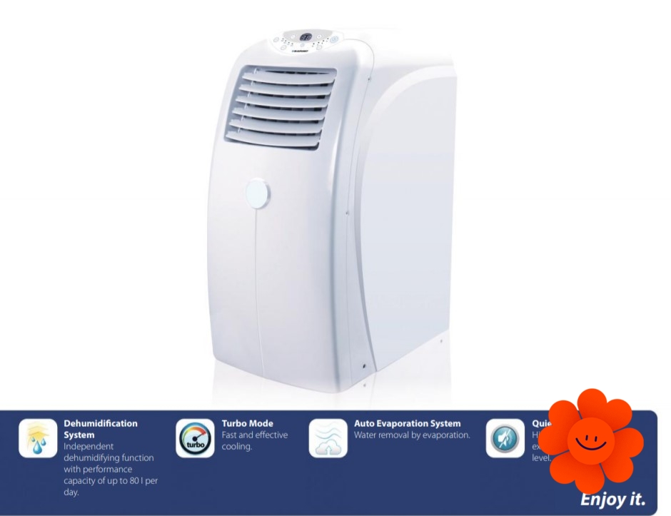Blaupunkt Arrifana 15 mobiles Klimagerät mit der Kühlleistung 4,4 kW gehört zu den leistungsfähigsten Luftkühlgeräten dieser Art auf dem Markt. Der Turbo-Modus sichert sofortige Kühlung während der heißen Tage. Dieses Klimagerät wurde bei extremen Wetterbedingungen in Australien mit folgendem Ergebnis getestet: Wasserentfernung pro Tag – 80 Liter bei der Temperatur von 35°C und Luftfeuchtigkeit von 85%. Das bestätigt die Tatsache, dass das Wasserverdampfungssystem dieses Klimagerätes ist besonders wirksam und dazu unabhängig.