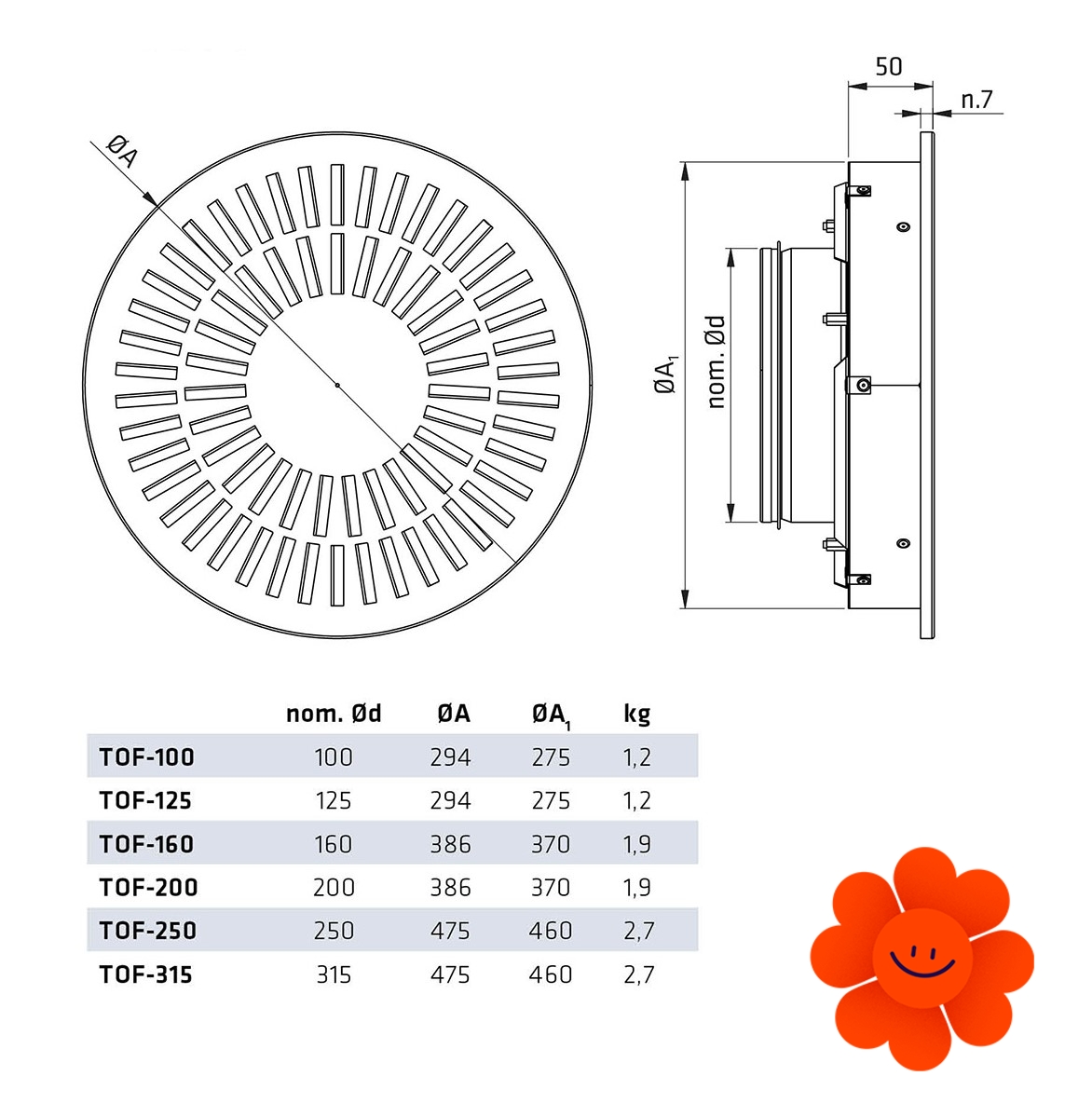TOF ist ein eleganter Drallauslass geeignet für die Decken und Zuluft in den Raum. Der Drallauslass eignet sich in fast alle Innenräume und aus diesem Grund ist er sehr beliebt bei Architekten. Zu seinen Vorteilen gehören niedrige Konstruktionshöhe und spezielle Perforierung, dank welcher der Drallauslass ein unauffälliger Zubehör im Innenraum bei der Seitenansicht ist. Deshalb kann er problemlos in demselben Raum auch mit anderer Einrichtung kombiniert werden.