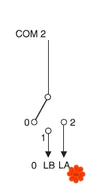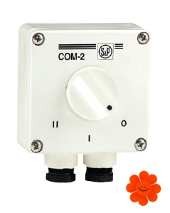 COM 2 ist ein Drehzahlumschalter mit zwei Positionen, die für die Umschaltung und Abschaltung von Ventilatoren bestimmt ist. Der Kasten wird aus dem Kunststoff hergestellt.