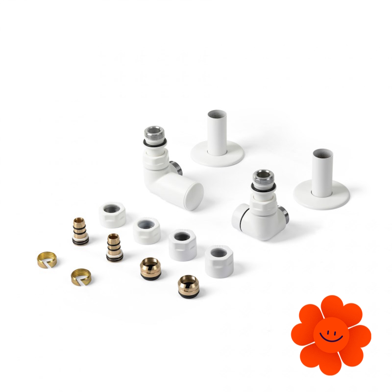 Das manuelle Design-Winkelset der Marke Terma mit der Auswahlmöglichkeit einer beliebigen maßgeschneiderten Farbausführung, das Set kann also an den beliebigen Heizkörper oder ein anderes Zubehör angepasst werden.