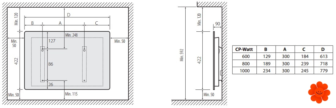- Die Steckdose kann man auch hinter dem Konvektor anbringen, damit man die Kabel und Steckdose nicht sieht.