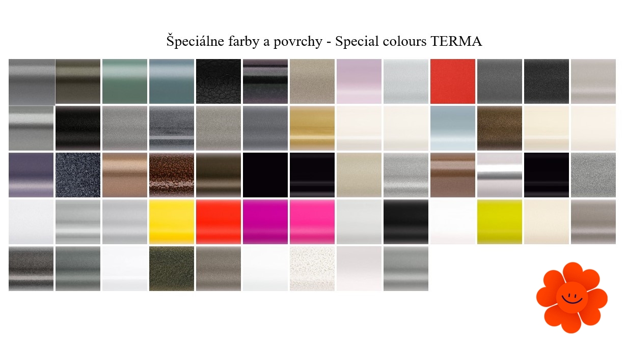 - Spezielle Farben und Oberfläche aus der Farbenmustermappe Terma sind glänzend und matte lackierte Oberflächenbearbeitungen, dank welchen Ihr Heizkörper ein wirklich ausgezeichnetes dekoratives Zubehör wird.