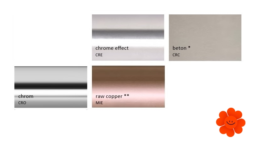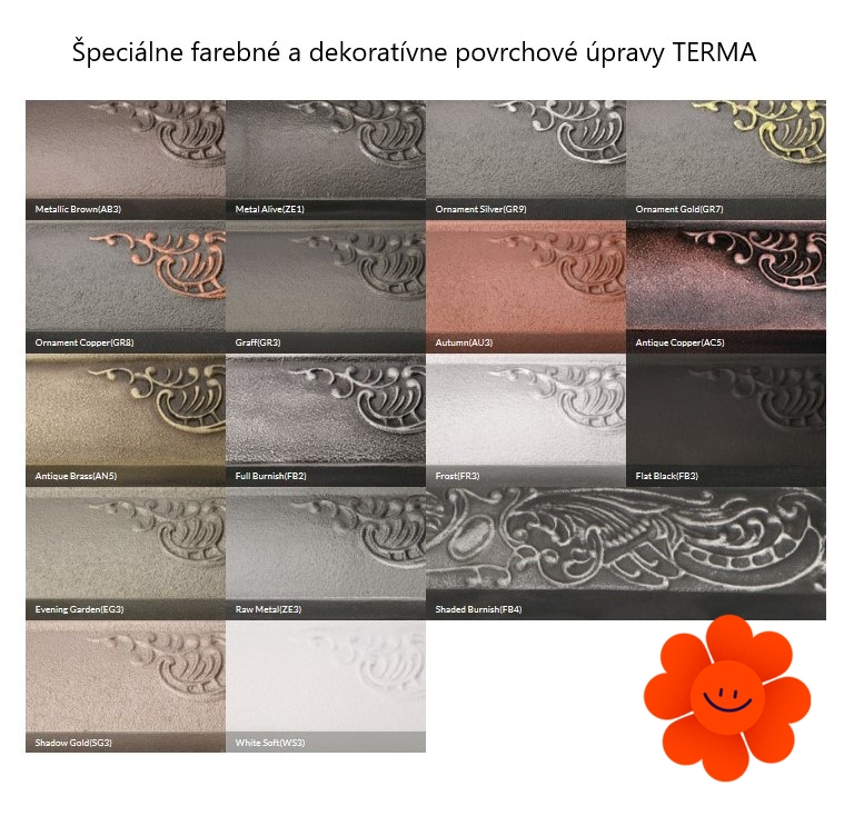 In der Farbenmustermappe Terma finden Sie auch spezielle Bearbeitung für konkrete Modelle, zum Beispiel Chrom - Copper für Heizkörper Pajak oder die Oberfläche Beton für Heizkörper Case Slim.