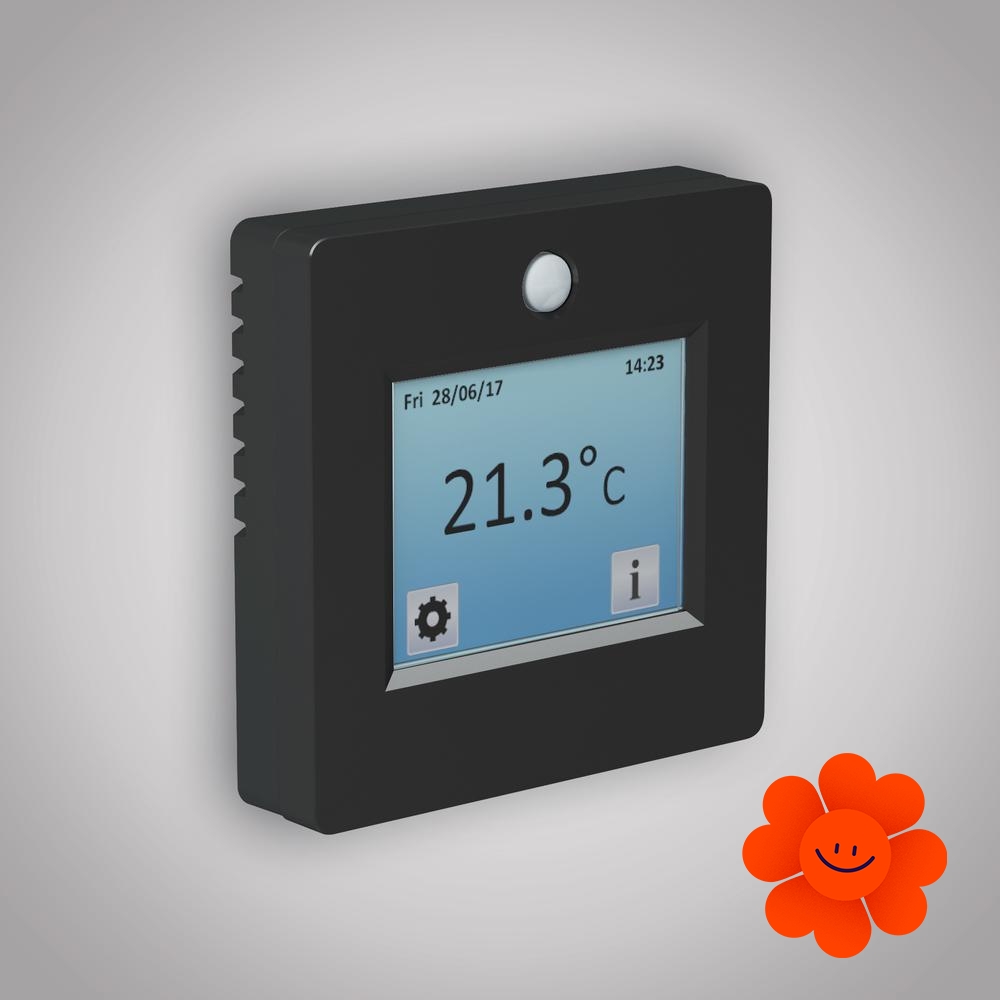 Fenix TFT-2 ist ein elektronischer programmierbarer Thermostat mit dem Touchscreen mit wählbarer Hintergrundfarbe. Sie können aus 6 Sprachoptionen wählen.