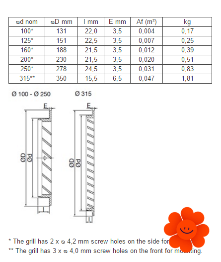 Das Ansauggitter wird mit dem Schutzgitter aus dem Edelstahl ausgestattet (10x10 mm). Verfügbare Durchmesser ø100-315 mm.