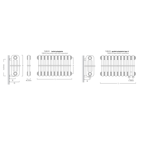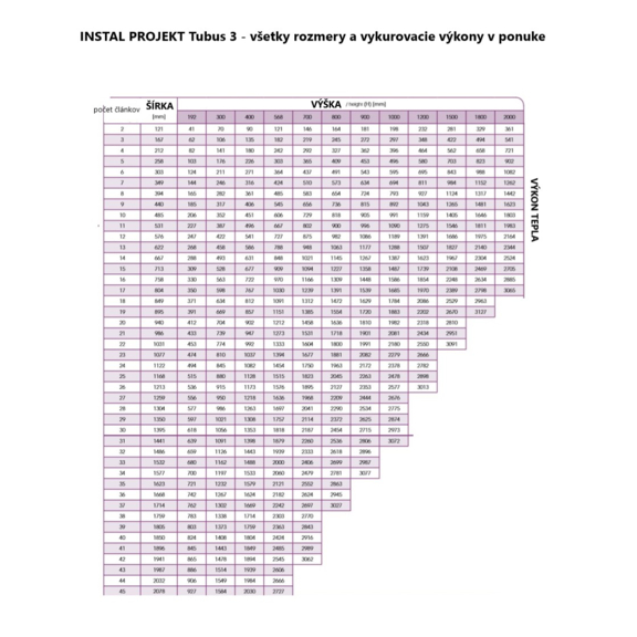 Der Heizkörper Tubus 3 ist ein Modell mit der dreifachen Rohreihung, in der Breite von 2 bis 45 Glieder und der Höhe von 293 bis 1993 mm zur Wahl. Die Firma INSTAL-PROJEKT bietet auch den doppelten Tubus 2 und den vierfachen Tubus 4 an.