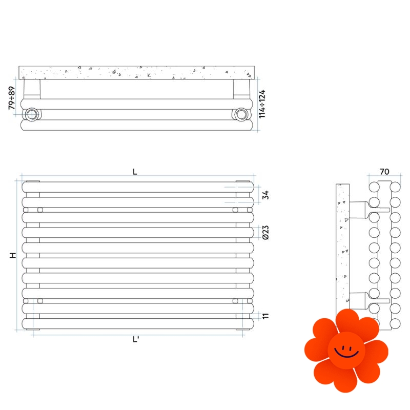 Das Modell Arpa 23_2 zeichnet sich durch eine modulare Bauweise aus, die es ermöglicht, Größe und Leistung nach Bedarf anzupassen. Der Heizkörper ist in 14 verschiedenen Längen erhältlich, in Konfigurationen von 4 bis 40 Elementen, mit einer Heizleistung von 211 bis 3062 W. Es ist auch eine einreihige Version des Heizkörpers verfügbar.
