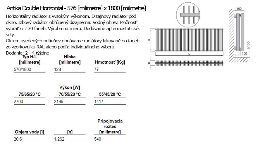 Der moderne Heizkörper Antika Double Horizontal arbeitet auf der Basis vom Warmwasser-Betrieb. Sie können aus drei Größenvarianten wählen. Wählen Sie eine Farbvariante, die sich am besten für Ihr Interieur eignet. Er ist auch in der vertikalen Variante ISAN Antika Double erhältlich.