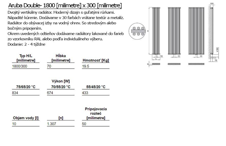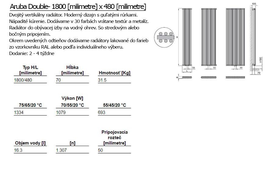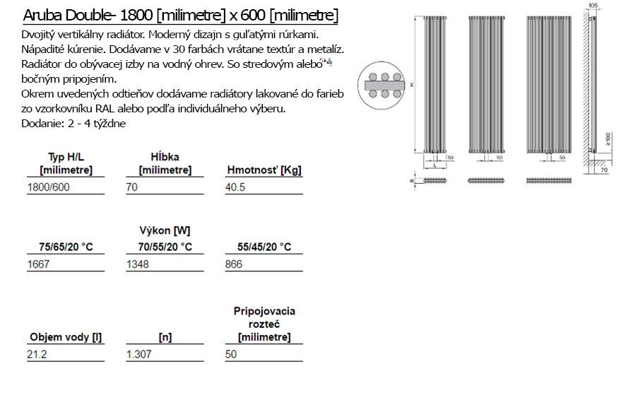 Wählen Sie aus unserem breiten Angebot von Farbausführungen. Wir empfehlen metallische, cremefarbige Farbe und Texturen. Der Heizkörper Aruba Double arbeitet auf der Basis vom Warmwasser-Betrieb. Die Möglichkeit der Anschlussändrung und des Kaufs vom Zubehör. Dieser Heizkörper ist auch in der horizontalen Variante ISAN Aruba Double Horizontal erhältlich.