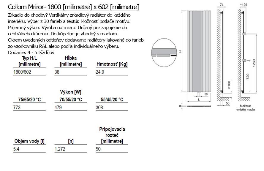 Der Heizkörper Collom Mirror kann auch ein funktionelles architektonisches Designstück in Ihrem Interieur dienen. Dieser Heizkörper kann dem umliegenden Raum farblich angepasst werden. Wir empfehlen Ihnen, für Collom Mirror einen Chrom-Handuchhalter und ein Thermostat-Set nachzukaufen.