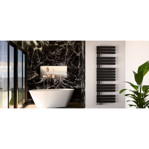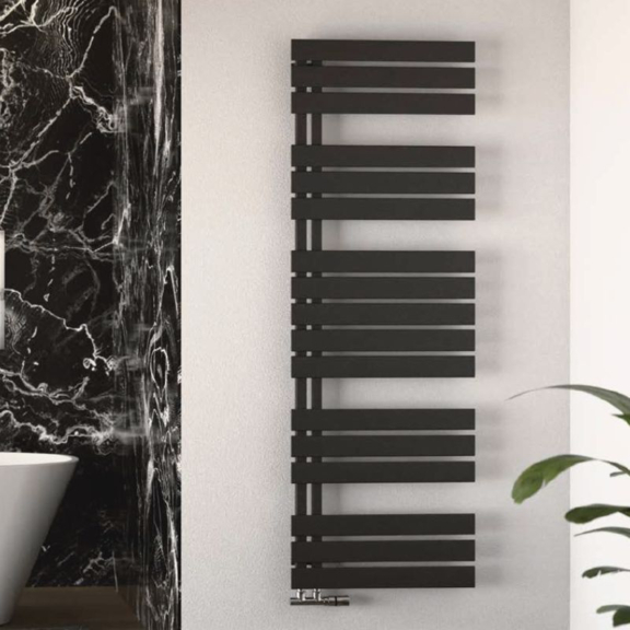 Designheizkörper ISAN Thea fällt sofort durch seine breiten, unregelmäßig angeordneten Profile ins Auge. Er verbindet modernes Aussehen mit praktischer Funktionalität und ist daher ideal zum Aufhängen und Trocknen von Handtüchern geeignet.