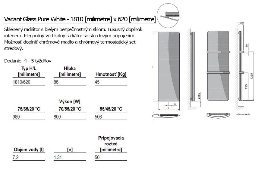 Das stilvolle harte Sicherheitsglas mit der gebogenen Form hindert leistungsfähige Stahlrohre. Variant Glass ist die Garantie der hohen Qualität, Wärmeleistung und schnellen Raumerwärmung. Sie können den Heizkörper um einen Chrom-Handtuchhalter und ein Chrom-Thermostat-Set ergänzen.
