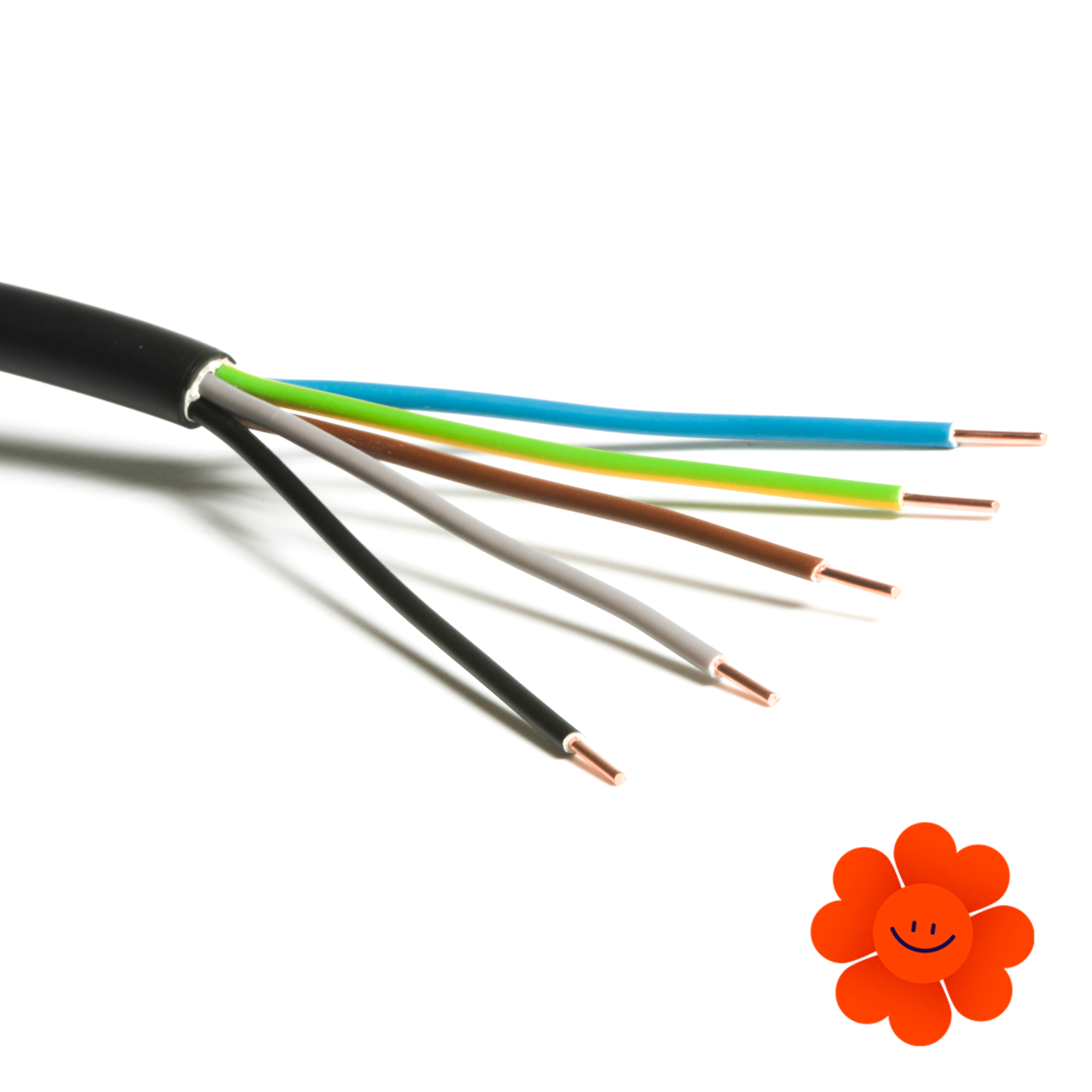 Rundes Kabel mit der Dicke von 1,5 mm2 besteht aus 5 Adern des Kupferkerns, jede Ader ist eigenständig isoliert (PVC) und farbig differenziert. Die Außenhülle des Kabels besteht aus der Schicht des Füllgummis, auf der sich der gegen UV-Strahlung beständige schwarze Mantel aus PVC befindet.