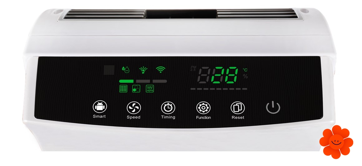 Dank dem Luftqualitätsindikator können Sie sich jederzeit über den Zustand der Luftqualität informieren. Zur Verfügung sind auch die Funktion Nachtmodus, Zeitgeber und auch die Bemerkung vom Filterwechsel.