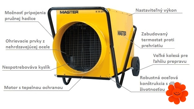 Das Luftaustauschvolumen das Heizgerätes Master B 30 EPR ist 3.500 m3/h. Der eingebaute Umschalter ermöglicht die Umschaltung zwischen den Leistungen - Lage 1 für das Abschalten, Lage 2 für den Lüfter (Möglichkeit der Umschaltung auf Sommer- und Winterregime), Lage 3 für die Leistung 15,0 kW (Heizleistung 12.900 kcal/h), Lage 4 für die Leistung 30,0 kW (Heizleistung 25.800 kcal/h).