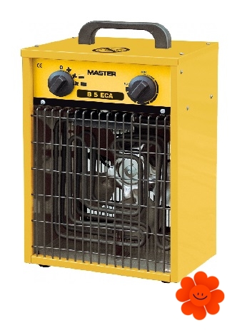 Heizgerät Master B 5 ECA hat ein Luftaustauschvolumen von 557 m3/h. Der eingebaute Umschalter ermöglicht die Umschaltung zwischen den Leistungen - Lage 1 für das Ausschalten, Lage 2 für den Lüfter, Lage 3 für die Leistung 2,5 kW und Lage 4 für die Leistung 5,0 kW. Dieses elektrisches Heizgerät bietet dem Verbraucher das günstige Verhältnis an: Preis : Leistung, kein Sauerstoffverbrauch, es produziert keinen Rauch oder Geruch und ist geräuscharm. Die Motoren sind mit dem Wärmeschutz erledigt und die widerstandsfähige metallische Ausführung garantiert den Langleibigkeit.