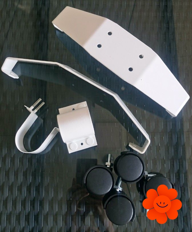 Im Paket sind Rollen und Montagezubehör enthalten.