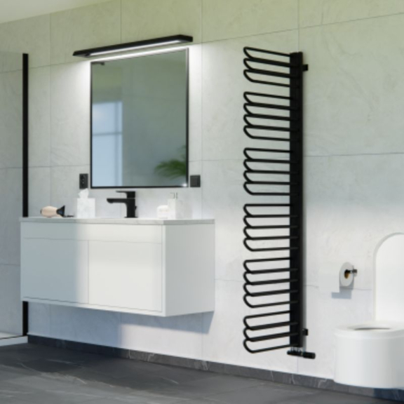 Der RADOX Serpentine Design-Wasserheizkörper ist mit seiner originellen Lamellenanordnung in S-Form ein markantes Element im Innenraum. Diese moderne Form ist nicht nur ein Blickfang, sondern bietet auch praktischen Platz zum Aufhängen von Handtüchern.