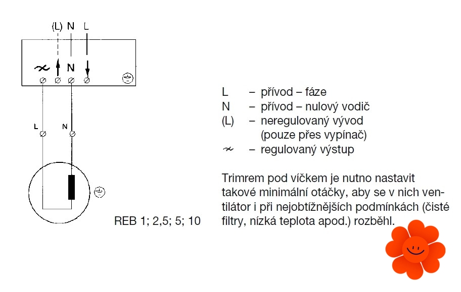 Einphasiger Triac-Drehzahlsteller REB 1 N wird für stufenlose Drehzahlregulierung des Ventilators und gleichzeitig als Schalter benutzt. Minimale Drehzahl des Ventilators kann nach der Abnahme von Deckung durch die Teildrehung des Regelelements eingestellt werden.