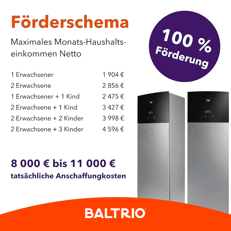 Hinweis zu Preisbeispielen: Monatliches Nettoeinkommen umgerechnet auf 12 Mal im Jahr; Beispiel einer Anlage mit 14 kW; Abweichungen je nach Systemkonfiguration. Die Förderhöhe bei der Wärmepumpe ist auf max. 25 586 € begrenzt.