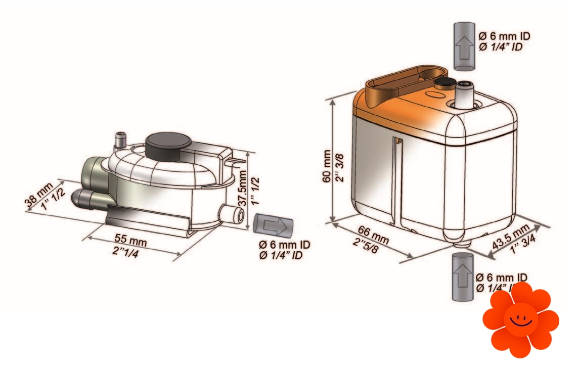• geringe Abmessungen (Kasten mit Pumpe - 66x44x59mm)