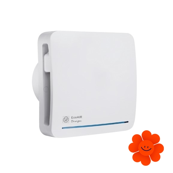 EcoAIR DESIGN M Ecowatt ist ein Modell des Radialventilators mit einstellbarer Nachlaufzeit von 1-30 Minuten, Hygrostat 60 % bis 90 % relativer Feuchtigkeit und Zugschalter.