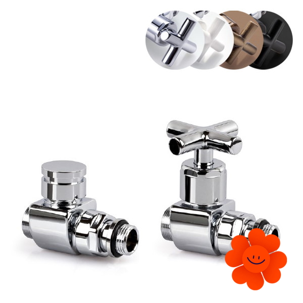 Manuelles direktes Design-Ventilset mit einer Abänderungsmöglichkeit zum thermostatischen Ventil – Paar 0386+0364 (ein Zuleitungsventil, ein Ableitungsventil und 2x Gewinde).