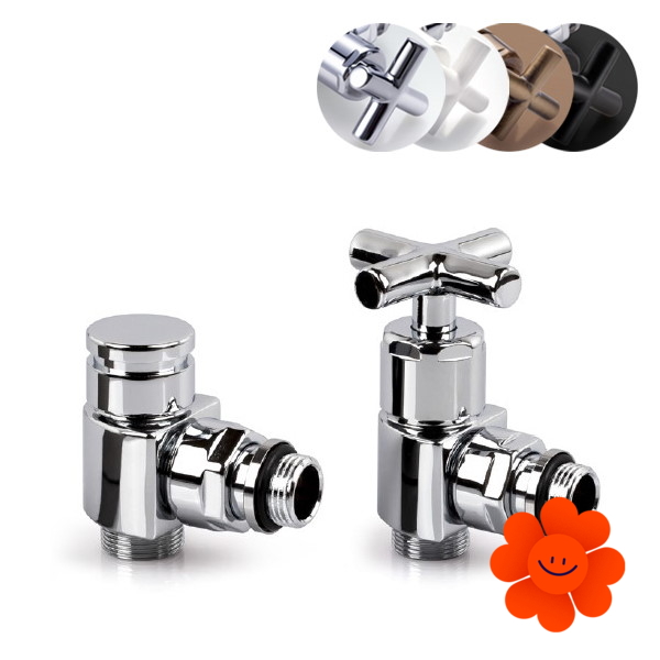 Manuelles Design-Eckventilset mit einer Abänderungsmöglichkeit zum thermostatischen Ventil – Paar 0385+0363 (ein Zuleitungsventil, ein Ableitungsventil und 2x Gewinde).