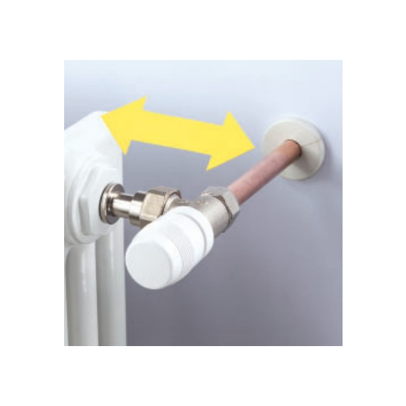 SR Teleskop-Verlängerungsstück (0302) wird dann benutzt, wenn die Rohre vom Heizkörper so entfernt sind, dass das Ventil zum Heizkörper nicht angeschlossen werden kann. Das Verlängerungsstück wird zwischen das Ventil und den Heizkörper anmontiert.