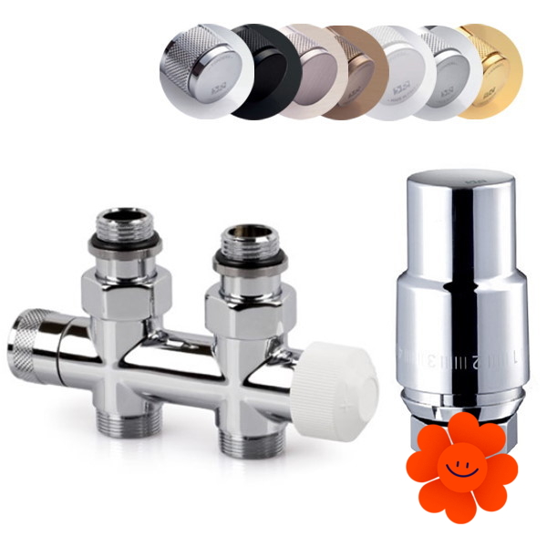Thermostatisches direktes Design-Mittelventil– das Set enthält ein Mittelventil (0686), einen thermostatischen Kopf Domus und 2x Gewinde.