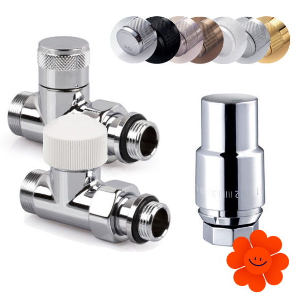 Thermostatisches direktes Designventilset – Paar 0635+0675+N093 (ein Zuleitungsventil, ein Ableitungsventil, ein Kopf Domus und 2x Gewinde).