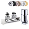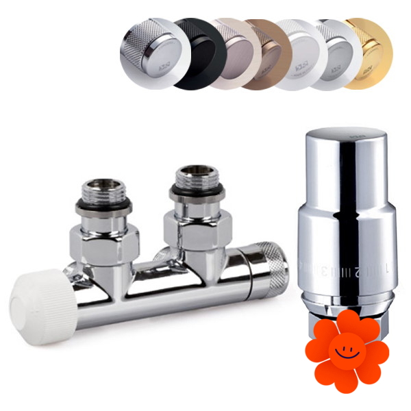 Linkes thermostatisches Design-Mittelventil - das Set enthält ein Mittelventil (0685), einen thermostatischen Kopf Domus und 2x Gewinde.