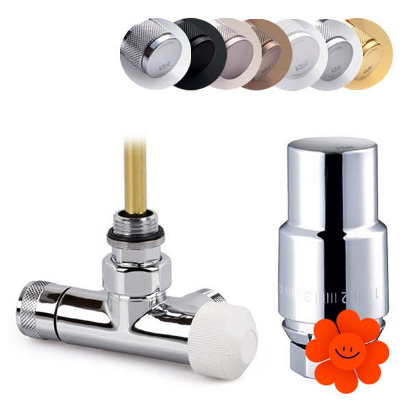 Rechtes thermostatisches Design-Eck-Mittelventil – das Set enthält ein Eckventil mit einer Lanze (0646), einen thermostatischen Kopf Domus und 2x Gewinde.
