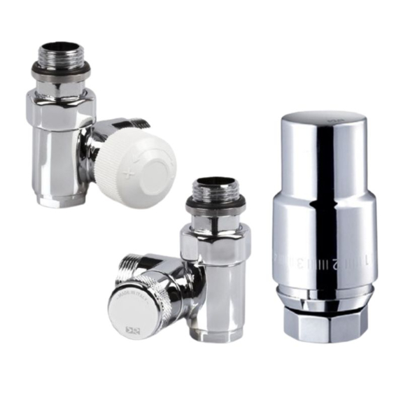 Linkes thermostatisches Design-Winkelset – Paar 0642+0638+N090 (ein Zuleitungsventil, ein Ableitungsventil, ein Kopf Domus und 2x Gewinde).