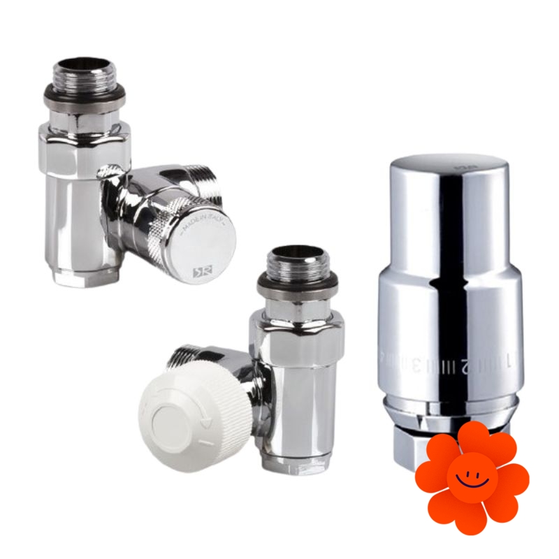 Rechtes thermostatisches Design-Winkelset – Paar 0641+0639+N090 (ein Zuleitungsventil, ein Ableitungsventil, ein Kopf Domus und 2x Gewinde).
