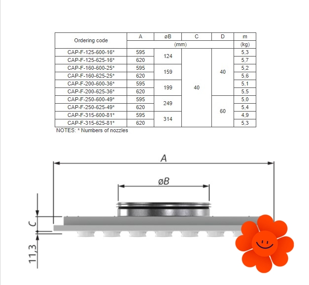 CAP-F ist ein Decken-, Zuluft/Abluft-, Düsendurchlass mit der Montageplatte, der in die Kassettendecke 600x600 oder 625x625 (gerade in das T-Profil) und vor allem für die Zuluft bestimmt ist. Der Anemostat ist ein Luftverteiler, der zum Bestandteil der Lüftungsanlage gehört. Jede Düse des Anemostats kann selbstständig unter beliebigen Winkel (360°) eingestellt werden.