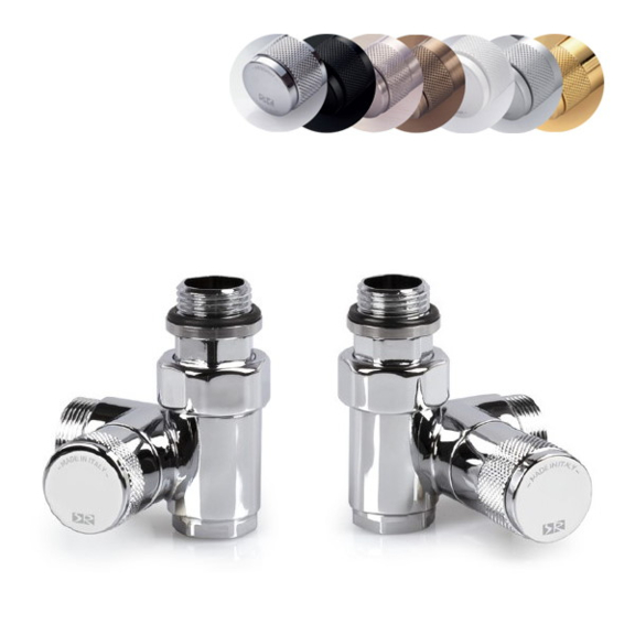 Das thermostatische Designeckset enthält: thermostatisches Ventil, Abschlussventil, Adapter AL-PEX ∅ 16x2 und Kupfer ∅ 15.
