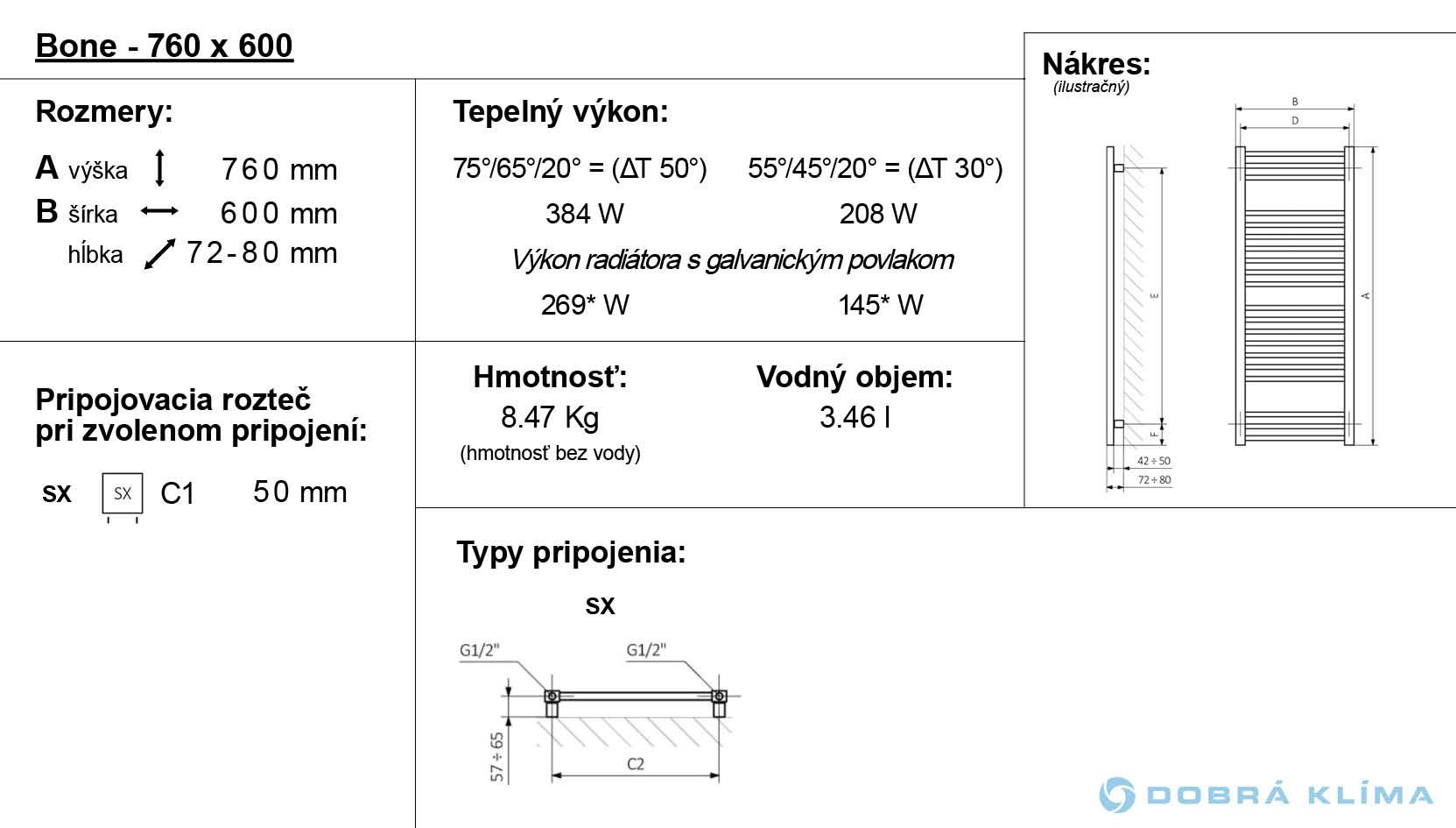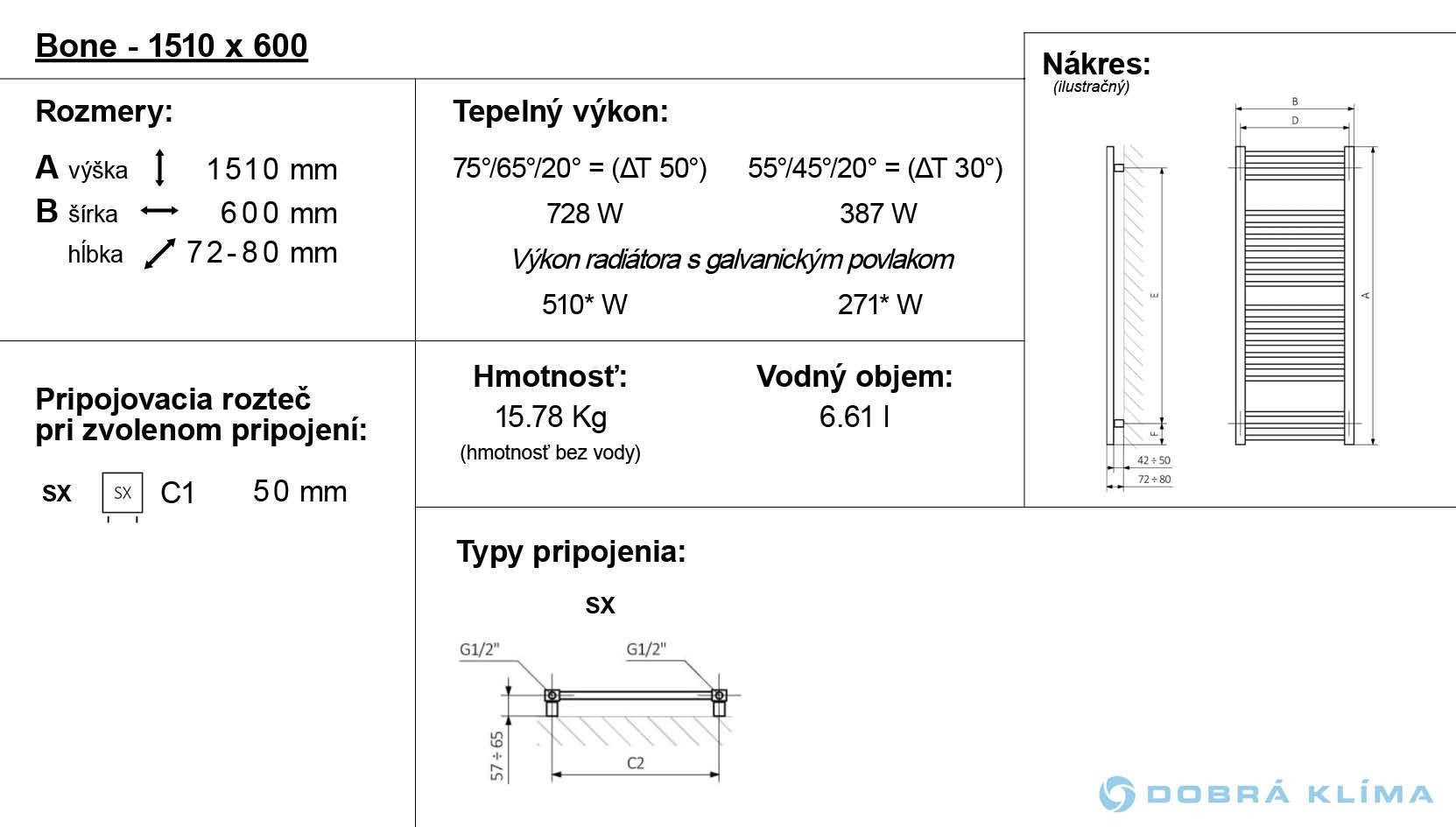 Seine Wärmeleistung beträgt 320-728 W. Der Heizkörper Bone ist in der Version: mit dem Warmwasserbetrieb erhältlich, in unserem Angebot finden Sie auch die Variante Bone mit dem elektrischen Betrieb und mit der eingebauten Heizpatrone Bone One.