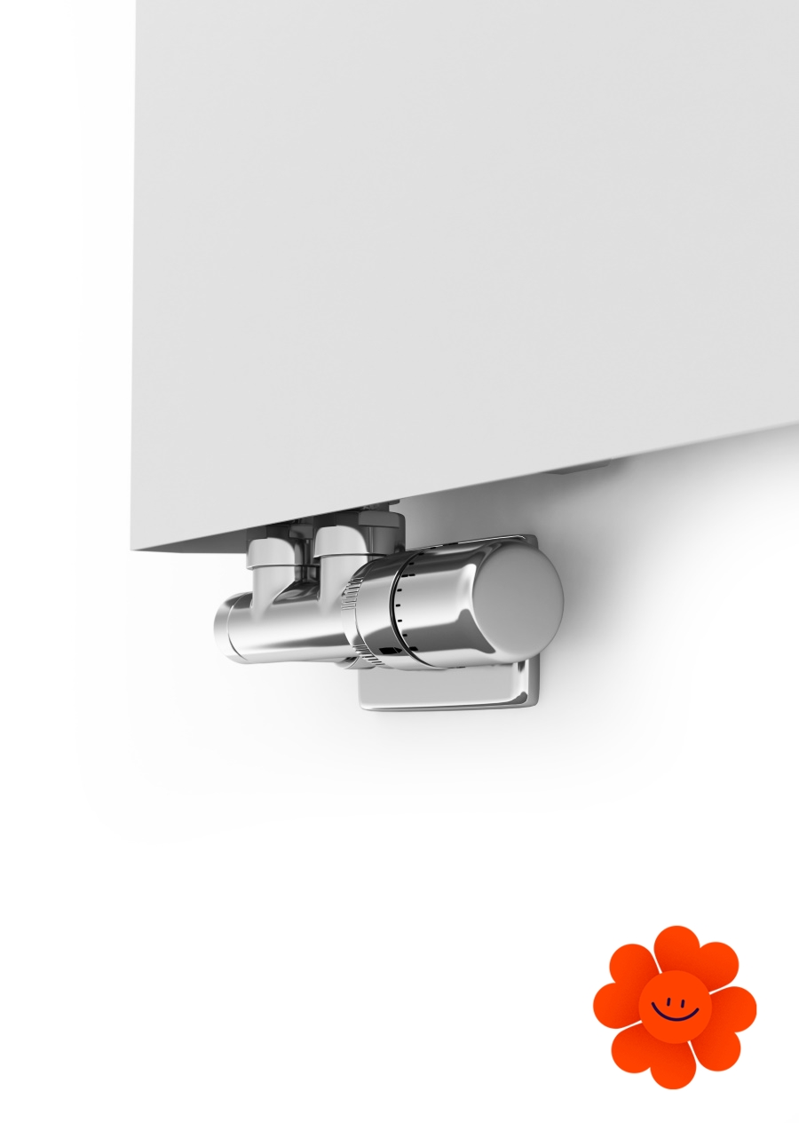 Das Thermostatventil mit den Abmessungen von 50 mm und der stilvolle Thermostatkopf SLIM werden zusammen mit den Adaptern ALUPEX und Kupferrohren geliefert.