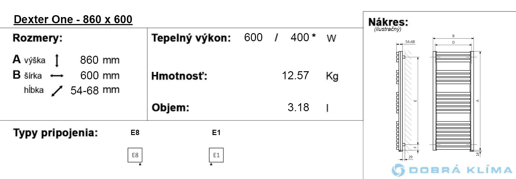 Verfügbare Varianten: mit elektrischem Betrieb. In unserem Angebot finden Sie auch das Modell Dexter mit dem Warmwasser-Betrieb. Wärmeleistung: 400 – 1000 W.
