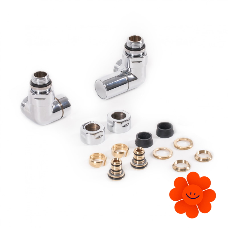 Das rechte manuelle Winkelset enthält: Regelventil, Abschlussventil, Adapter AL-PEX ∅ 16x2 und Kupfer ∅ 15.