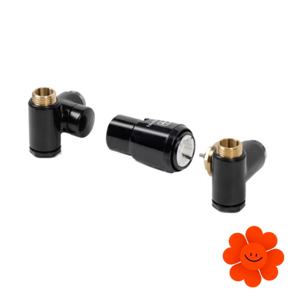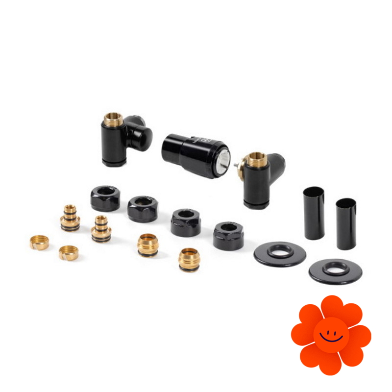 Thermostatisches Design-Winkelset der Marke Terma mit einer wählbaren maßgetreu hergestellten Farbausführung, dank der man das Set zu einem beliebigen Heizkörper oder einem anderen Zubehör anpassen kann.