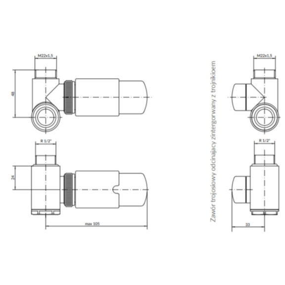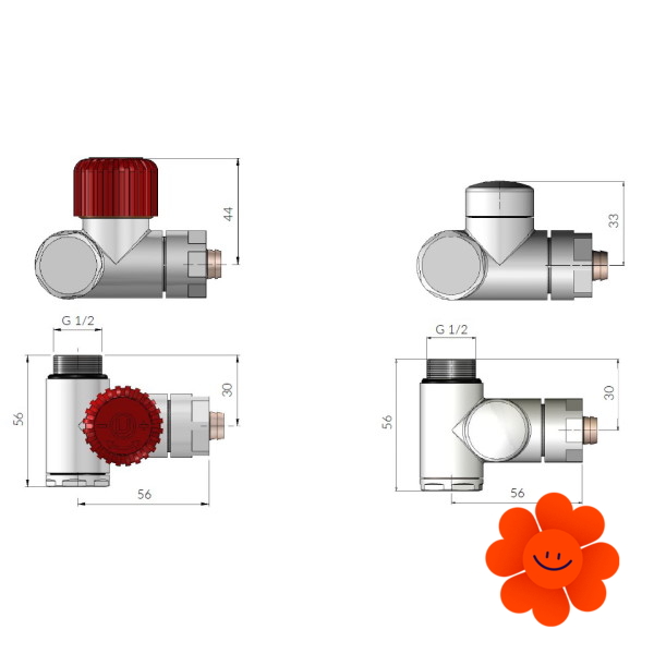 - thermostatisches Winkelventil mit Möglichkeit eines kombinierten Anschlusses