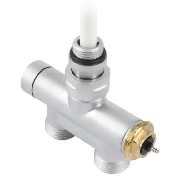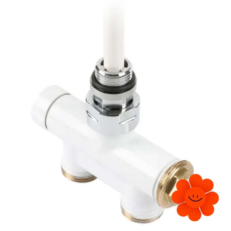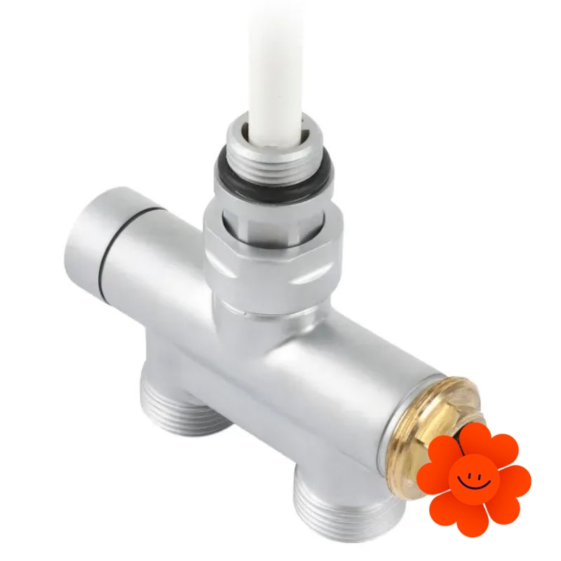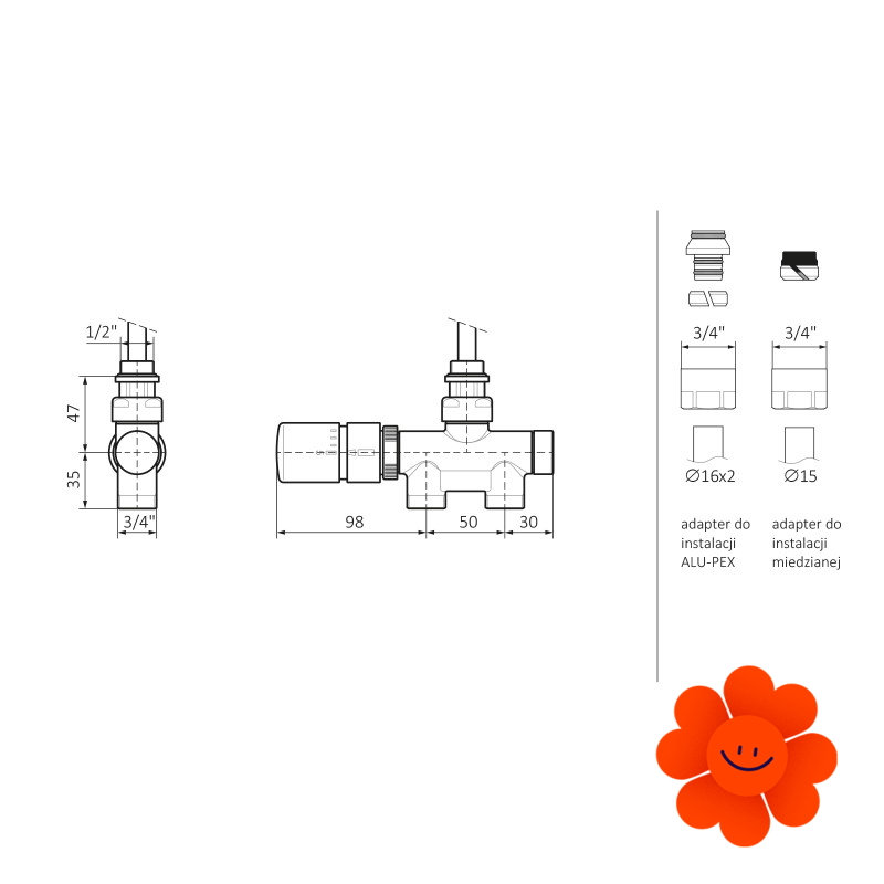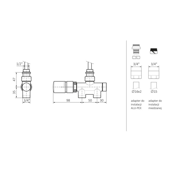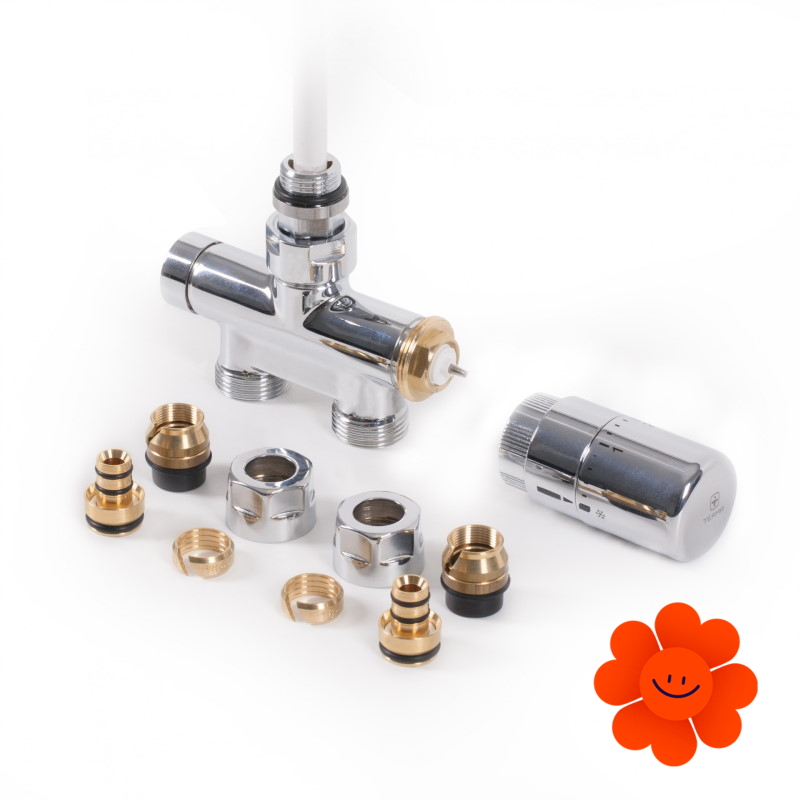 Das thermostatische Designset mit dem Tauchrohr enthält: direktes thermostatisches Ventil mit Tauchrohr, thermostatischer Kopf SLIM, Adapter AL-PEX ∅ 16x2 und Kupfer ∅ 15.
