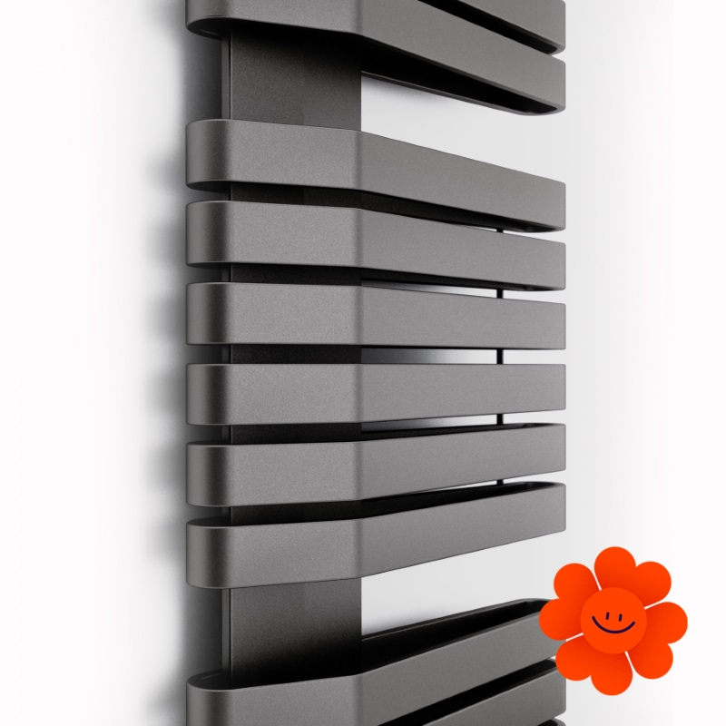 TERMA Iron S ist ein leistungsfähiger Designheizkörper, dessen flache Heizrohre große Wärmeabgabe schaffen. Diese speziellen Profile haben eine rechteckige Form mit Abmessungen von 10 x 50 mm. Obwohl die Profile asymmetrisch an einem zentralen Kollektor befestigt sind, wirkt der Heizkörper sehr harmonisch und originell.