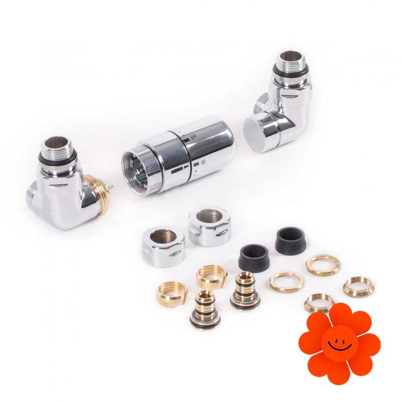 Linker thermostatischer Winkelset beinhaltet: thermostatisches Ventil, Absperrventil, thermostatischen Kopf SLIM, Adapter AL-PEX ∅ 16x2 und Kupfer ∅ 15.
