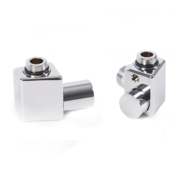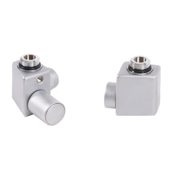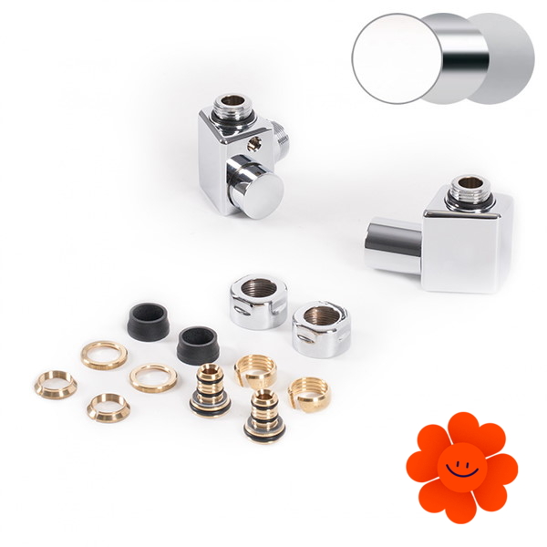 Rechtes manuelles Winkelset enthält: ein Regelventil, ein Absperrventil, Adapter AL-PEX ∅ 16x2 und Kupfer ∅ 15.