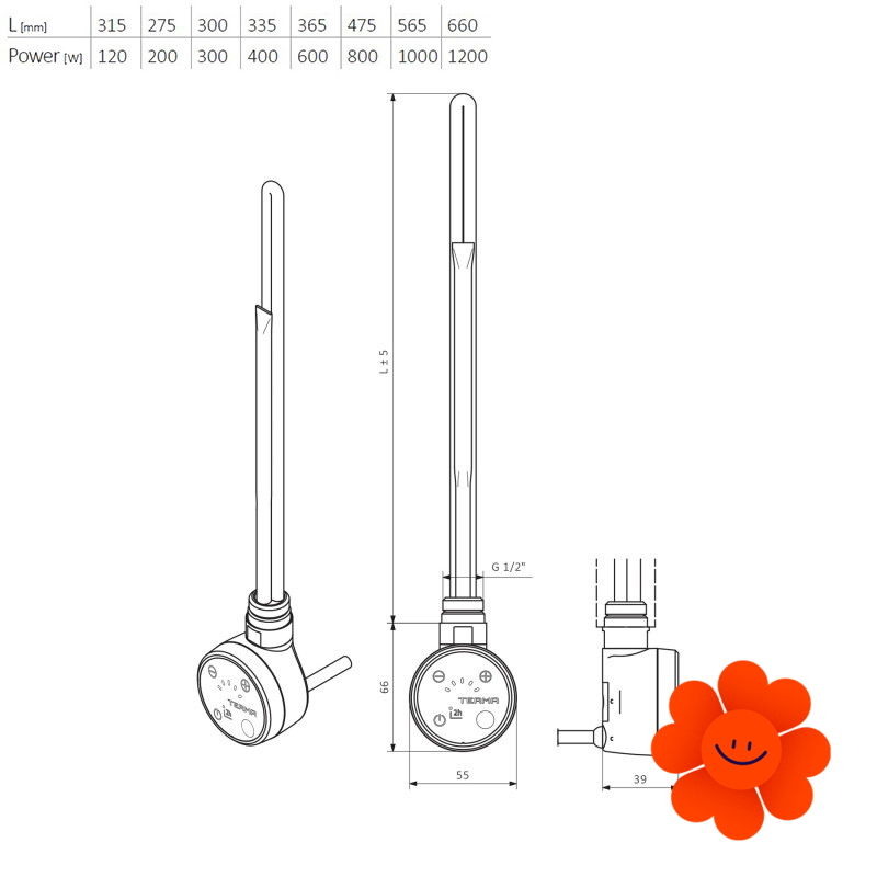 Betriebsspannung. 230V/50 Hz, Schutzklasse I., Temperaturspanne 30-60 °C (in Schritten jeweils zu 5°C), Außenanschlussgewinde G1/2“ (auf dem Heizrohr), Heizrohrleistung 120-1200 W.