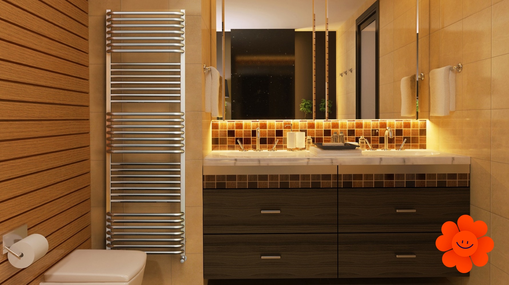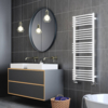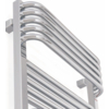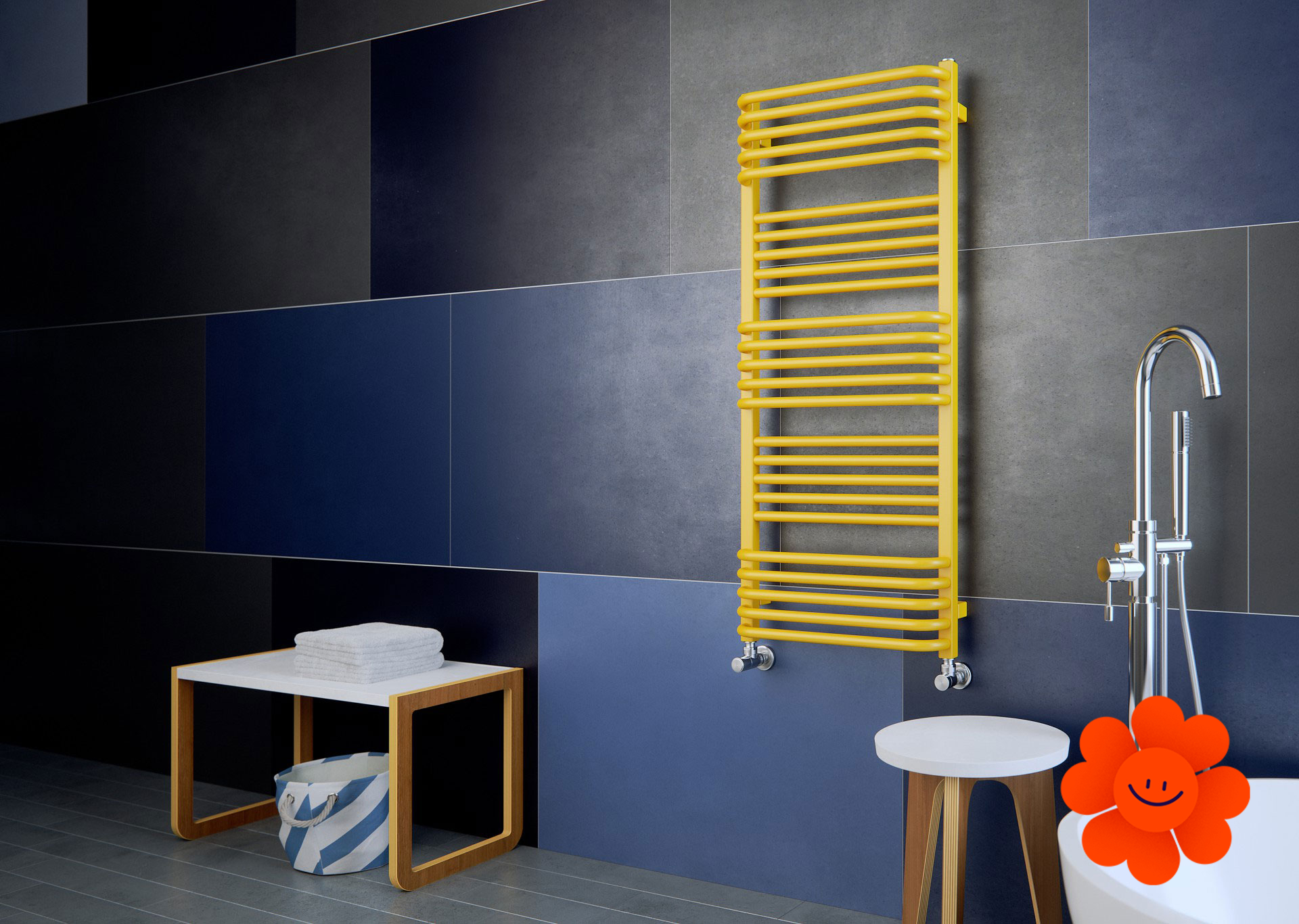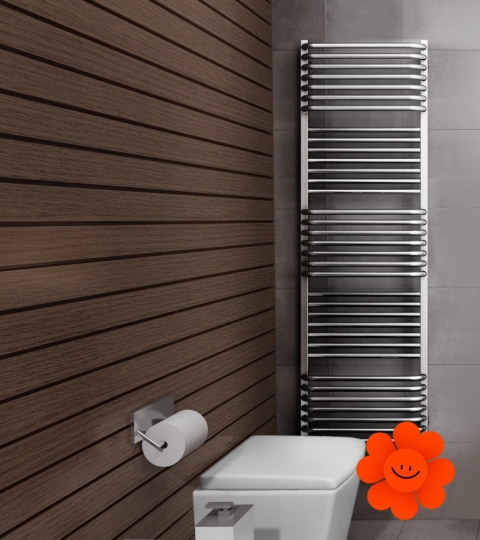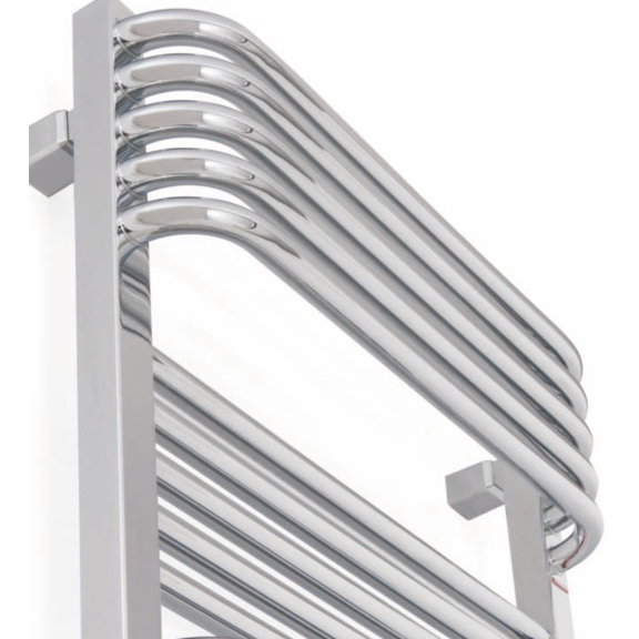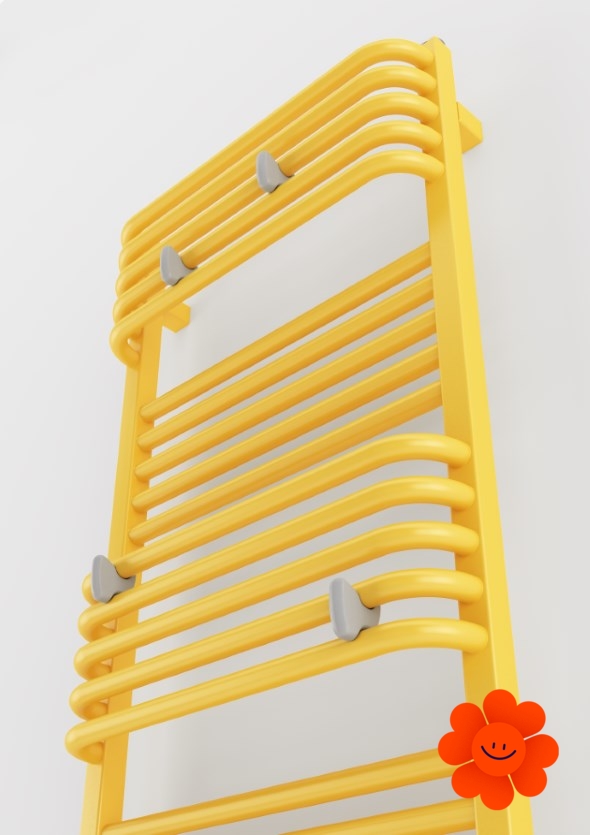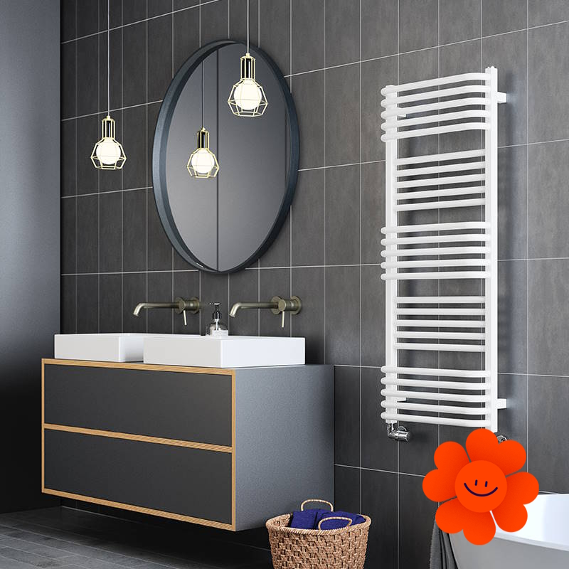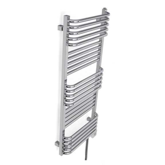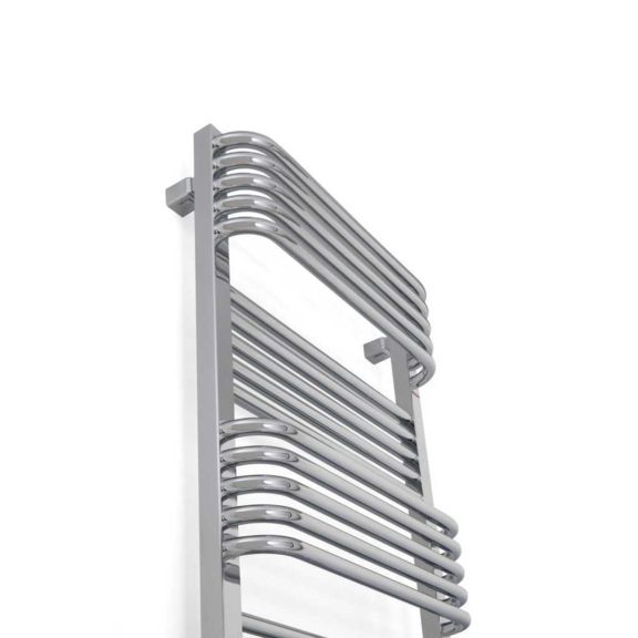 Der effektive und praktische elektrische Heizkörper Pola für Badezimmer. Das gebogene Rohr und der Raum zwischen seinen Teilen erleichtern das Hängen von Textilien zum Trocknen.