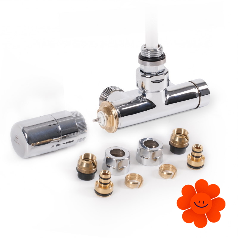 Rechter ecke thermostatischer Set beinhaltet: hermostatisches Ventil, Absperrventil, thermostatischen Kopf SLIM, Adapter AL-PEX ∅ 16x2 und Kupfer ∅ 15.